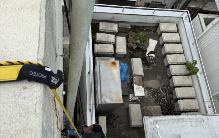 【狛江市】ロープアクセス工事による壁面設置配管撤去